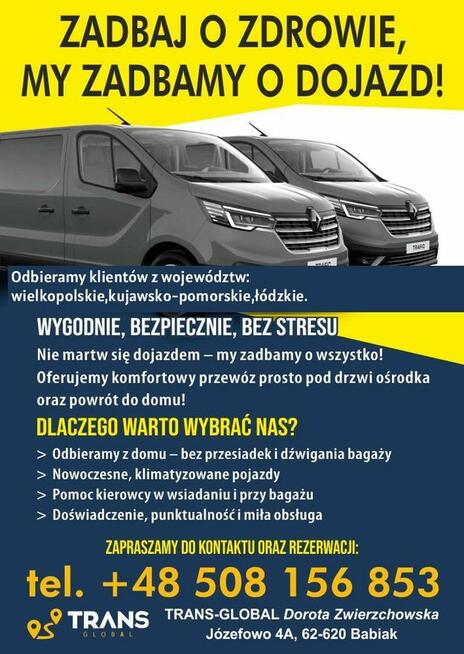 Trans-Global w oferuje przewóz osób do sanatorium oraz odbiór po zakończonym turnusie. Ponadto obsługujemy transfer na ...